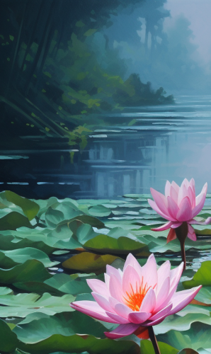 an oil painting on canvas that shows lilies in pond, in the style of olivier ledroit, atmospheric serenity, dima dmitriev, fine art realism, dark cyan and pink --ar 19:32