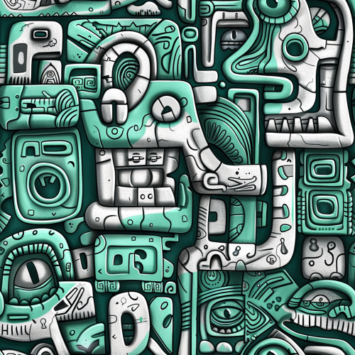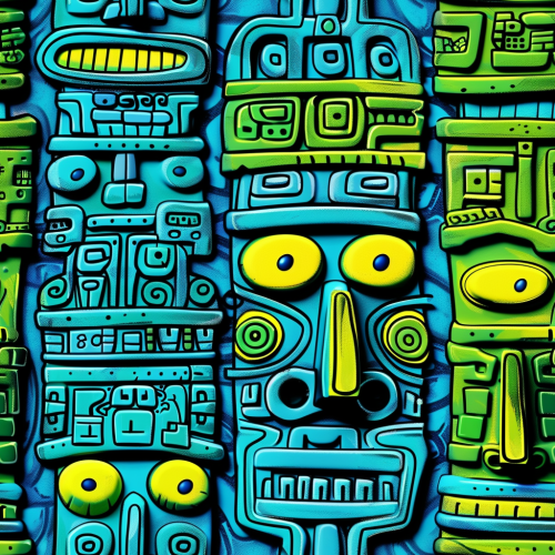 mutant hydnellum peckii mayan hieroglyphs, surreal fine art ferrofluid pattern 3D stone forms, Basil Wolverton and Robert Crumb Mayan stone art, 3D relief, simple black and white line art colorized blue and green, --tile --v 6.0