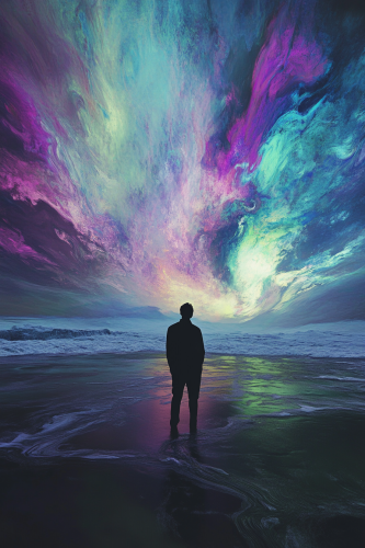 autostereographic and melancholic style, it shows a silhouette in a super hard snowstorm in the arctic, the northern lights looks like if you mixed up all diffrent oil colors, the colors mix up with the water, surreal art and melancholic, --ar 2:3 --v 6.1