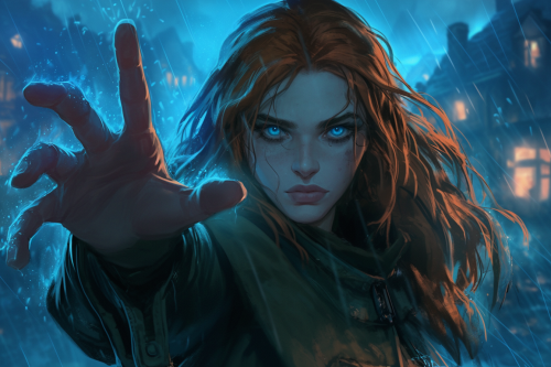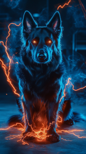 Chien dans un style semi-réaliste avec des pouvoirs de foudre, son pelage est d’un bleu sombre avec des motifs lumineux rappelant des éclairs. Ses yeux sont d’un éclat électrique, et des arcs électriques se forment autour de ses pattes et de sa queue. Le fond montre une scène dynamique avec un ciel orageux où des éclairs frappent le sol, créant une ambiance dramatique. 8K, highly detailed, --ar 9:16