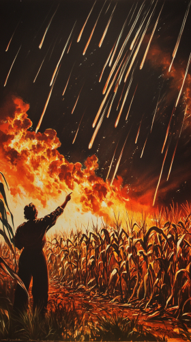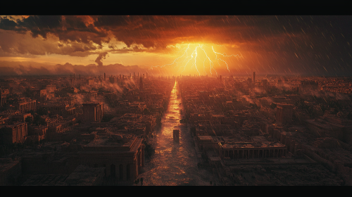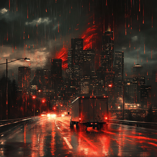 a uhaul truck driving out of the city of seattle under a storm. The storm is red with crimson raindrops. BIts of orange-red goo are smeared on teh city buildings and roads rounding the edges of the buildings. Lights are on in the city and there's little traffic. Powerful winds are buffeting the roads.