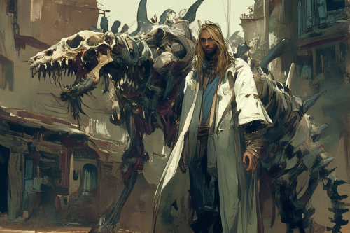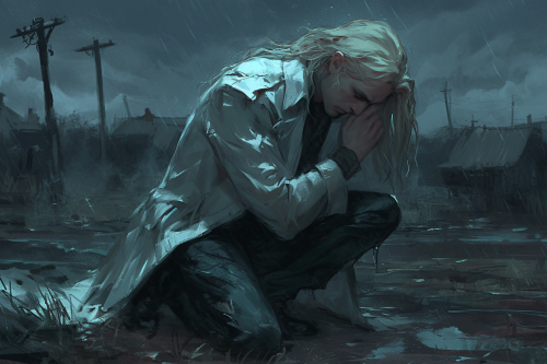 a man with long blonde hair and blue eyes wearing a white coat and kneeling on his knees in a dark dilapidated town during a storm + horror + art style of Capullo, Brom, Whelan, aly fell rutkowski, art germ, rossdraws, and franzzeta + art station + ultra detailed + hyper realistic + 8k --ar 3:2 --niji 6