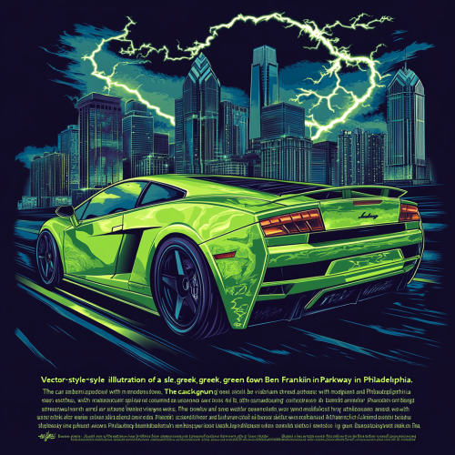 "Vector-style illustration of a sleek, green Lamborghini speeding down Ben Franklin Parkway in Philadelphia. The car should be vibrant and glossy, with modern streetwear-inspired aesthetics. The background features iconic Philadelphia skyline views, with lightning strikes illuminating the sky. The composition is designed for the back of a t-shirt, with bold lines and dynamic energy, capturing the fast-paced, electrifying feel of the city and car, blending seamlessly with the streetwear brand vibe." --v 6.1