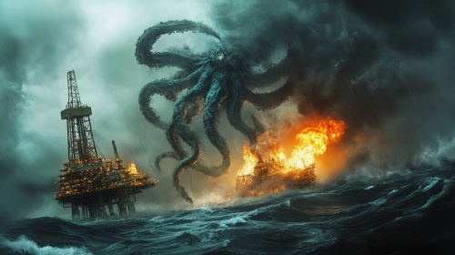 realistic photo of cthulu destroying an oil rig off the coast of scotland, stormy weather, early afternoon, using a high definition camera (even with water on the lens), Cthulu eldritch horror slamming on the oil rig with fire and smoke in the background. Scary and surreal, indistinguishable from real life, this can't be happening, ultra high definition --ar 16:9 --v 6.1