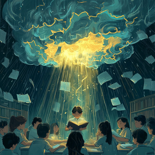 A classroom where most students are sitting under a dark, stormy sky, surrounded by swirling papers and rain. They look frustrated, hunched over their books, with expressions of stress and confusion. In contrast, one person is standing in a beam of sunlight, holding a glowing guide that creates a calm, clear sky around them. The glowing guide radiates warmth and clarity, while the others remain trapped in the storm of confusion, illustrating the contrast between struggle and effortless learning with a shortcut.