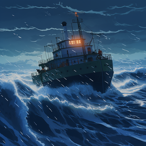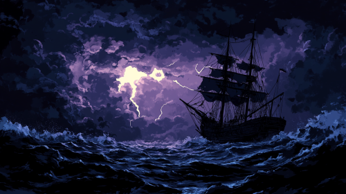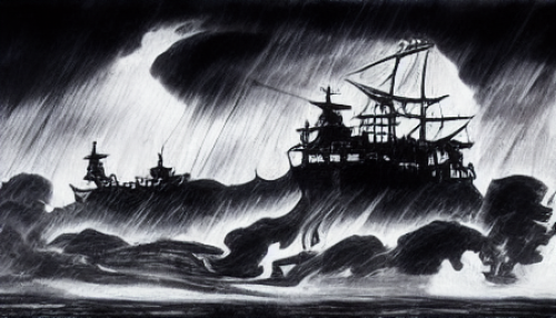 a anime drawing as black and white lineart of a old pirate ship in ocean while a storm is rustle up the water at dark night. a thunder is in background visible, creating slight highlights on the ship silhouette, wavy water, heavy storm, only the thunder enlit the scenery a bit --no blending colors, dithering, noise coloring --ar 16:9 --v 6.1