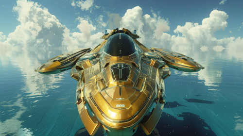 a large space fighter ship, gold, sleek, reflective, floating in ocean water, blue sky, looks a little like Samus aran's ship, facing the camera --ar 16:9