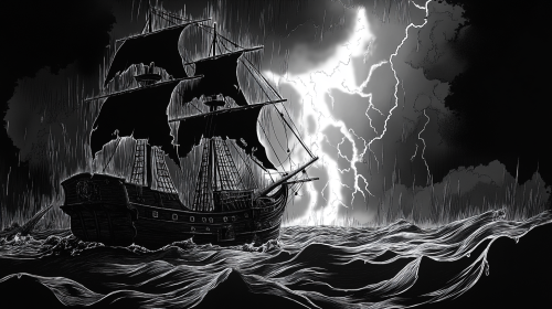 a anime drawing as black and white lineart of a old pirate ship in ocean while a storm is rustle up the water at dark night. a thunder is in background visible, creating slight highlights on the ship silhouette, wavy water, heavy storm, only the thunder enlit the scenery a bit --no blending colors, dithering, noise coloring --ar 16:9 --v 3