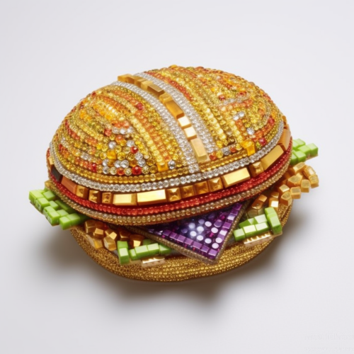 brooch in the shape of a burger made of beads and rhinestones, white background, photorealism, top view --v 5.1