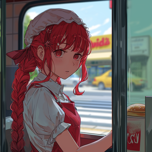 a miserable looking anime girl working the drive thru at Wendy's, anime style, ghibli style --v 6.0