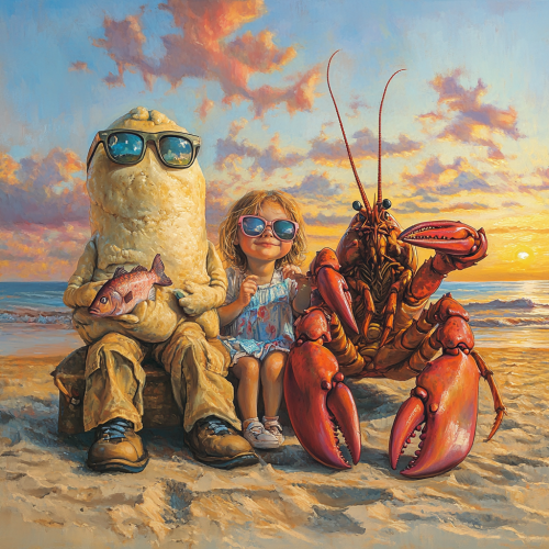 3 figures are on the beach enjoying the sunset view. a lump of bread dough wearing sunglasses, a lobster clamping a fish in one claw, a little girl sitting between them wearing sunglasses and holding her knees.
