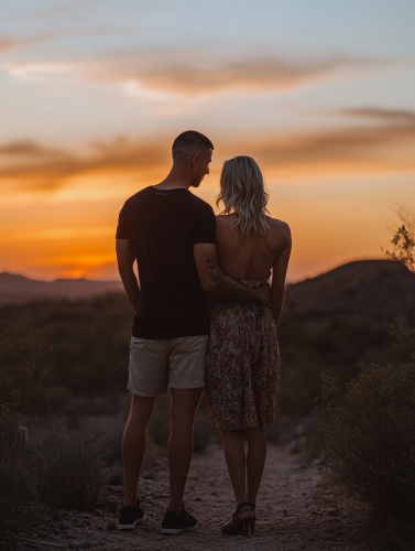 man with buzz cut hair wearing shorts and woman with blonde hair wearing flowy dress couple wearing black shoes standing in front of sunset facing away from camera, romantic, normal looking people, not models, full body in frame, realistic, photography, shot with a Nikon Z7 II, 50mm f/1.4 lens, natural soft tones --ar 3:4 --style raw --v 6.1