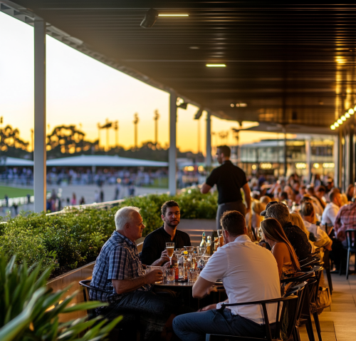 A group of people sitting at tables on the open-air terrace, enjoying drinks and snacks while watching the sunset at brisbane racing club. A waiter is walking around with glasses to serve the tables or individuals. The scene captures the social life during twilight, .Warm lighting adds to the ambiance of the outdoor dining experience. --ar 128:123