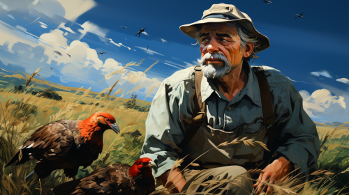 Location: farm Characters: The farmer and his old wife Narration: The sound of the farmer going to the chicken coop: "My pretty chicken! You've made me rich! I'll give you more food.", Ghibli studio style, --ar 16:9 --s 750