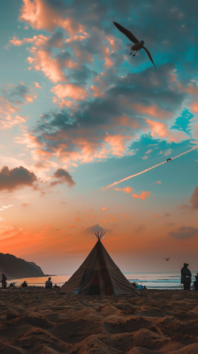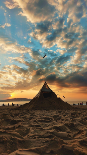 An Indian tent made purely out of sand at the beach on Jeju Island. a sunset sky , a flying seagull, People around me are watching with interest. --ar 9:16 --v 6.0