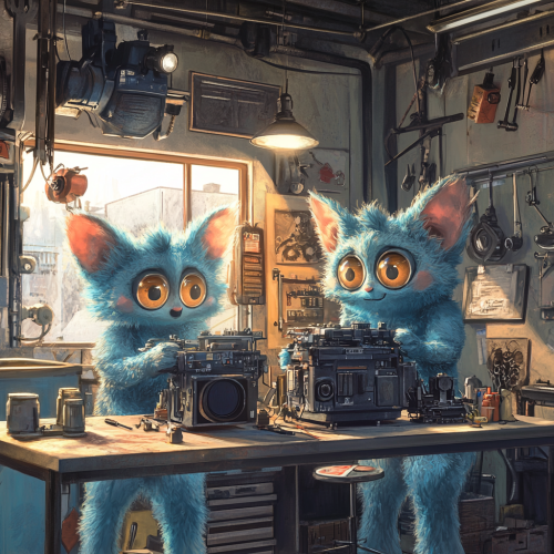 A stylized, anime-inspired mechanic shop with fuzzy, blue gremlin-like mechanics working on oversized cinema cameras. The gremlin mechanics have a playful, mischievous look, with soft, textured fur and expressive faces, blending a fantasy vibe with a workshop setting. The shop is minimalist, featuring only essential tools and equipment, with a limited color palette that uses a few bold colors and their shades for a vibrant but clean aesthetic. The atmosphere is fun and quirky, merging the look of a racing garage with whimsical, new-age gremlin mechanics working on film equipment.
