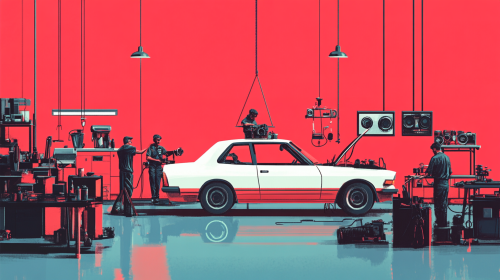 Mechanics fixing cameras in workshop - abstract art.