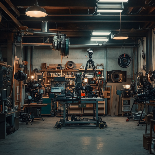 Retro-inspired mechanic shop where all tools and equipment are designed for video production. Large cinema cameras sit on car lifts, tripods replace engine hoists, and shelves are filled with lenses, film reels, and cables as if they were spare parts. Mechanics in rugged workwear carefully adjust camera gears and lenses. Lighting rigs hang from the ceiling like classic shop lamps, casting a warm, cinematic glow.