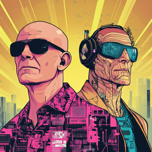 a podcast cover promotional image for a podcast about AI and user experience. It needs to look edgy and mix old school technology with modern big data tech. It should have an interesting juxtaposition between the real world and the digital world. It should look like an action movie style, a little bit retro and it should feature 2 main people; one being a white bald man, the other being an indian.
