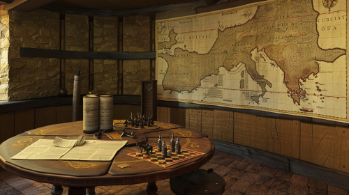 view through an open window into a dark alley of a medieval city. Dark shadows, eerie atmosphere. In the background there is a group of armed and armoured knights, hardly visible in the darkness. Only silhouettes. No faces can be seen. These knights are targets for the spectator in the room