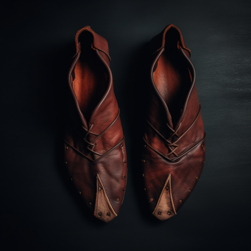 top down view of medieval leather handmade shoes, pointed, game art, flat --v 5.0