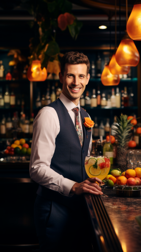 Wide shots in trendy british bar with bar tender showcase the finished drink' brilliant colors and artful presentation with fruit and herb garnishes. --ar 9:16