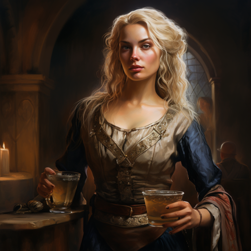 fantasy medieval barkeep, woman in fifties, blonde, brooding, carrying a platter of cut meat