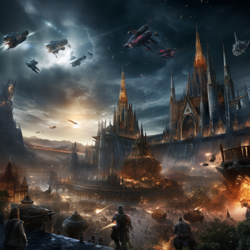 Imagine an ultra-realistic, vivid scene that blends a medieval siege with a futuristic space invasion. Set against the backdrop of an ancient city with gothic architecture and stone bridges, armored knights and archers are in the thick of battle, swords clashing and arrows in mid-flight. Above them, the sky is alight with the chaos of an interstellar conflict: spaceships dart between the spires, lasers streak through the atmosphere, and burning debris falls to the ground. The city's defenses are juxtaposed with futuristic technology, as both eras collide in a spectacular showdown. Sony fe 24-70 mm f/2.8 gm, 32k uhd, moody lighting, muted cinematic color grading