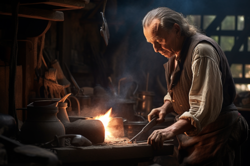 Blacksmith hammering metal in medieval workshop