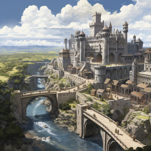A large medieval D&D city, the entrance is a single large bridge made of white stone, the outskirts of the city are protected by large thick stone walls and towers rise above the walls intermittently, the city rises in elevation the further inward and the back half rises above the rest where a large manor sits