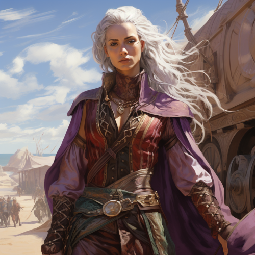 A sea-faring, violet-eyed, elf merchant mariner female dressed modestly in a burgundy gambeson and carrying a silver cimeter. Her silver hair is loosely braided with windswept tendrils as she guides a caravan of brightly coloured wagons along a desert road.