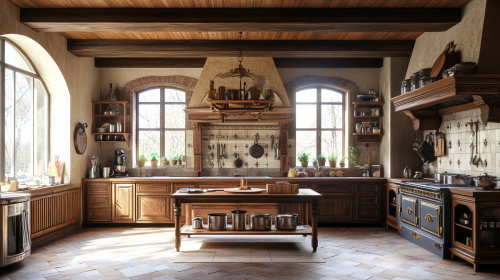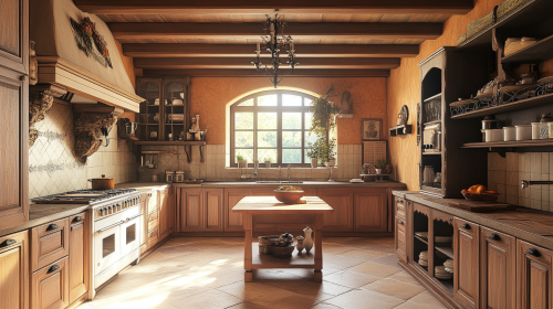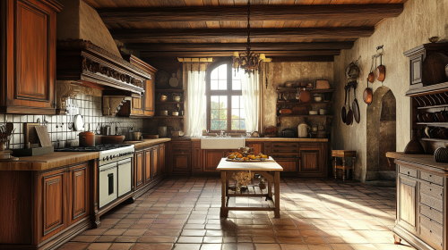 imagine a mediavle kitchen from 18th century classic style, wooden design ceiling, crown wall, realistic render, chimny, window, chimney table in the centre filled with kitchen items cear light nice visibility no modern items, --ar 16:9 --v 6.1
