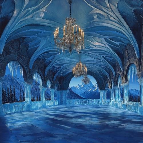 Interior of a medieval ballroom at night, with its ceiling carved from glacial ice and stalactites, arched windows overlooking snowcapped mountains, a crystal dance floor, and a balcony carved from ice at the end of the ballroom.