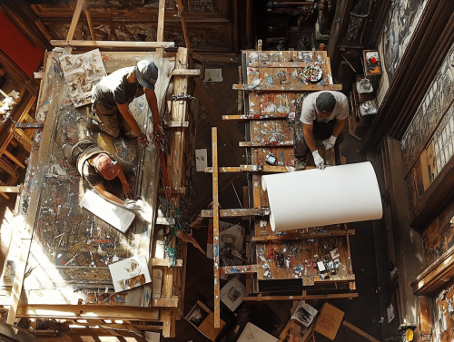 Top ariel view of an artist laying on his back on a wooden scaffold painting on the ceiling, while beside him, another painter wearing a baseball hat holds a white rolled banner, sitting beside him on one of the scaffold's bars The interior is a large chapel with wooden walls, numerous wooden ladders around, and an abundance of art supplies scattered everywhere. The scene is hyper-realistic and cinematic in style. --ar 4:3