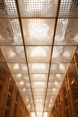 a ceiling with wooden beams and a white light, in the style of gridded abstractions, shin hanga, woven/perforated, confessional, aerial view, transparent/translucent medium, eye-catching detail --ar 2:3