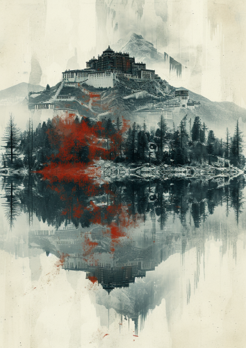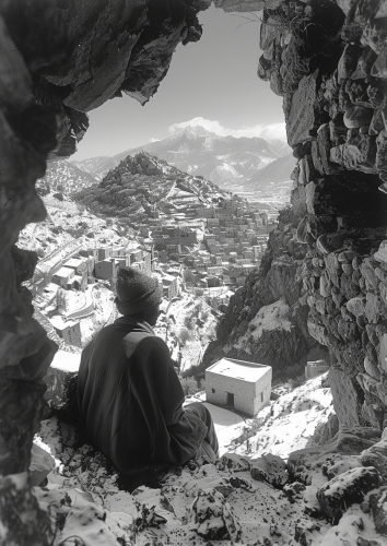 Over the mountains, dreams. medieval Infrared light image with Stanley Kubrick, medieval style, and a Shadowed view --v 6.0 --c 15 --ar 5:7 --s 750