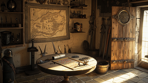 Medieval headquarters with a dashboard on the wall showing a medieval map of France, one round table in the center of the room with scroll paper and a gameboard with knights figurines, one sword lying on the table, some swords and armor in shelves and a door with light entering the room through it --no people --ar 16:9