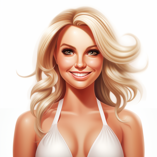 britney spears CARTOON headshot on a WHITE background, smiling, detailed, looking at the camera, BROWN EYES, wide forehead, HD, 8K, fancy white gown, full, layered BLONDE hair, smooth