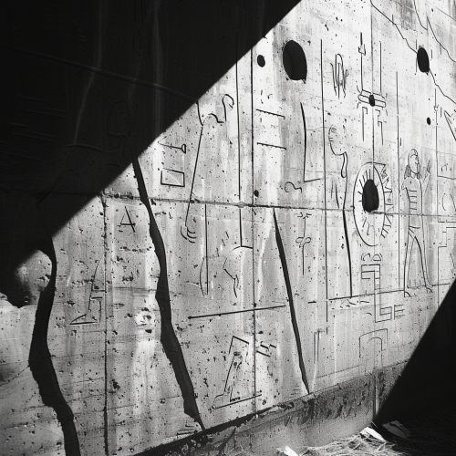 conrcrete wall with ancient abstract engravings that depict a nuclear war betweem people and destruction of civilization, sunlight, high contrast, black and white, ilford hp5, film photo, grain, shot on film camera, futuristic, geometrical, bladerunner, concrete, wallace office bladerunner, barrozi veiga --v 6.0
