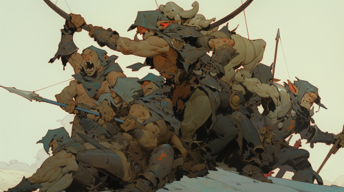 a group of dungeons and dragons goblins in armor attacking with bows and arrows, dynamic, masterful lighting composition style of frank frazetta, ultimate details --ar 16:9 --style expressive --niji 5 --s 750