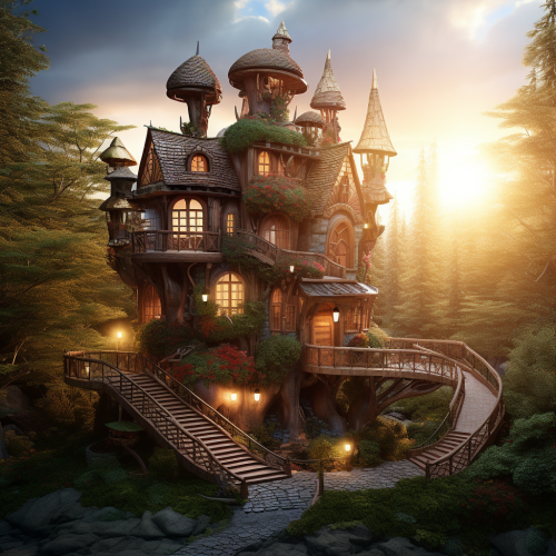 Behold the magic of the forest in this AI-crafted image featuring a three-story fairy house. As the sun sets on the horizon, casting a warm glow, the windows of the fairy house come alive with radiant light. Picture a winding staircase, gracefully connecting each level of the whimsical abode, surrounded by the towering trees of the enchanted forest. In the distance, three seagulls gracefully soar against the backdrop of the sunset sky, adding an extra touch of enchantment to this magical scene. Let your imagination wander as you explore this mystical world where the beauty of nature meets the charm of fairy magic.
