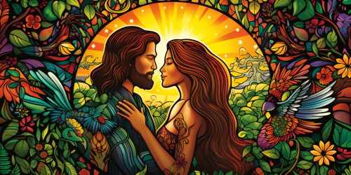 Surrealist illustration. Close-up portrait. Black American hippie woman with afro and colorful dashiki surrounded by vibrant flowers in a mystical garden. Vivid watercolor details. Swirling patterns and textures reminiscent of Kerry James Marshall's style. Soft focus and subtle gradient. Warm, golden lighting with pastel colors and gentle, feathery brushstrokes. Highly stylized, dreamlike atmosphere. Vibrant, expressive, and emotive, with bold linework and generous textures. Inspired by the works of Romare Bearden and Henri Rousseau. Dynamic, eclectic, full of movement and life. Detailed, intricate, and full of hidden symbolism. --v 6.1