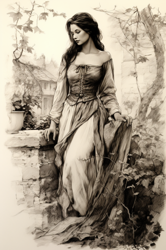 . "In a verdant medieval garden, a young very beautiful woman with highly attractive torso tends to a tapestry of vibrant flowers, her hands skillfully weaving a tapestry of intricate patterns and delicate blooms. Her attire is simple yet refined, echoing the pastoral beauty that surrounds her. As she gazes upon her work, a serene smile graces her lips, radiating a sense of harmony and connection to the natural world. The gentle melodies of songbirds and the rustling of leaves in the breeze provide a tranquil backdrop to her quiet industry."