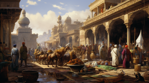 A bustling medieval market square filled with vendors selling goods, townsfolk in period attire, a central fountain, and stone buildings with thatched roofs, 1:1 --v 6.1