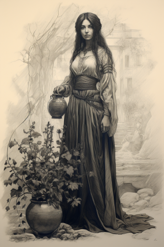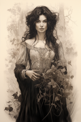 medieval engraving, pencil sketch on old parchment, old herbalist woman in the garden, witch, medieval dress, black hair, black and white, no colors, dark, rpg, fantasy --ar 2:3 --v 5.2