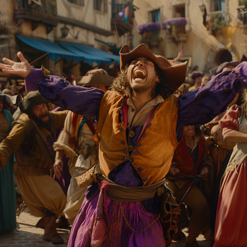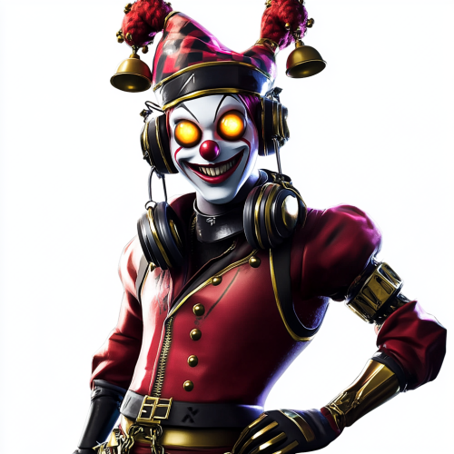 kings court court jester from reimagined as a electronica DJ, large ball shapes head, happy clown face, lit up eyes, hat with bells, rendered in style of fortnite, white background