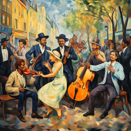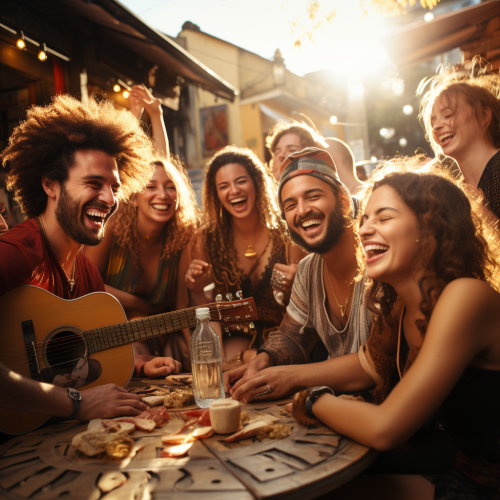 20 friends playing musical instruments at a bar table with girls around having fun and dancing in brazil, crownd, realistic, guitar, percussion, public, singing --s 750 --v 5.2