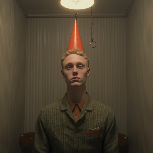 Photorealistic image of a 25 year-old man with feminine features and short blond hair wearing a diner's uniform and a jester's hat. He stands in a small windowless room with a chair as the room's only furniture. Above him is a single light-bulb fixture with a cord to turn it on and off.
