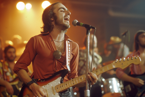 circa 1970, a 45 year old bald white man singing with full band CSNY, Crosby Stills Nash and Young at the Cavern in Winnipeg Manitoba, rock and roll, 70s detective pastiche --ar 3:2 --chaos 20