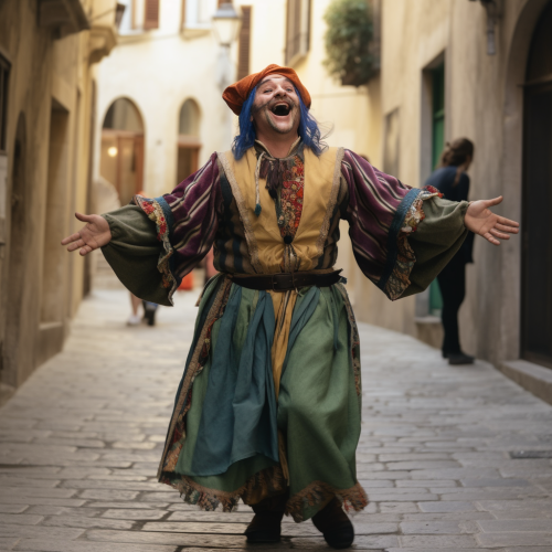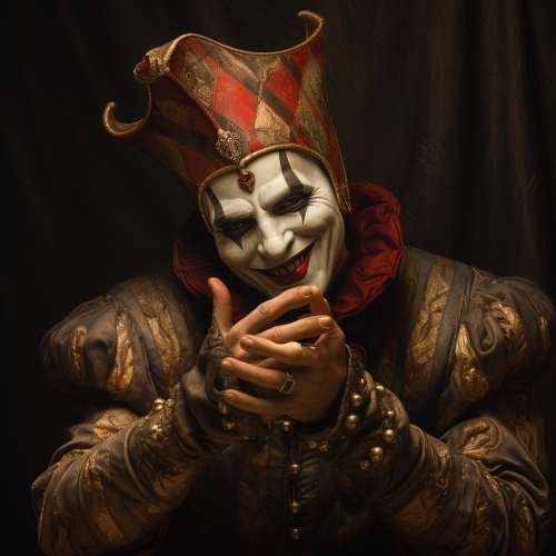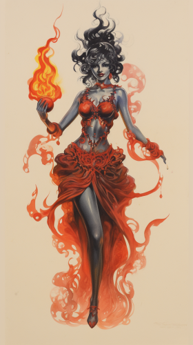 1970’s dark fantasy book paper art dungeons and dragons style drawing of evil female jester dancing with fire --ar 9:16